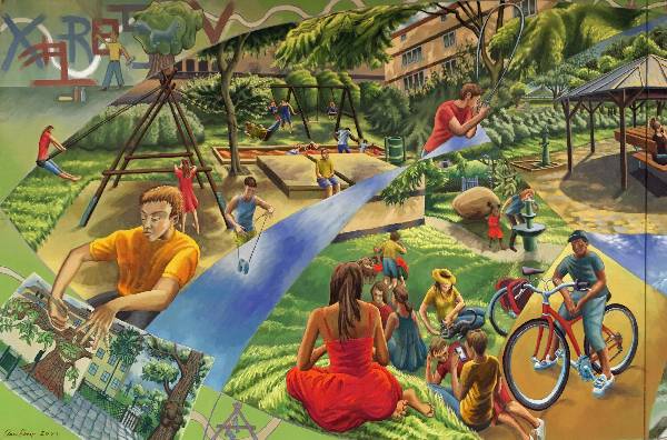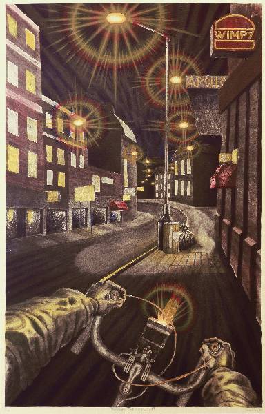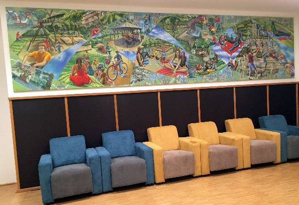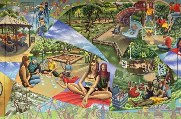 Painted panel from 'The Passage' mural cycle. Acrylic on rendered plaster wall, Kings College Hospital main corridor. (Approx. 7ft x 9ft). 1995.